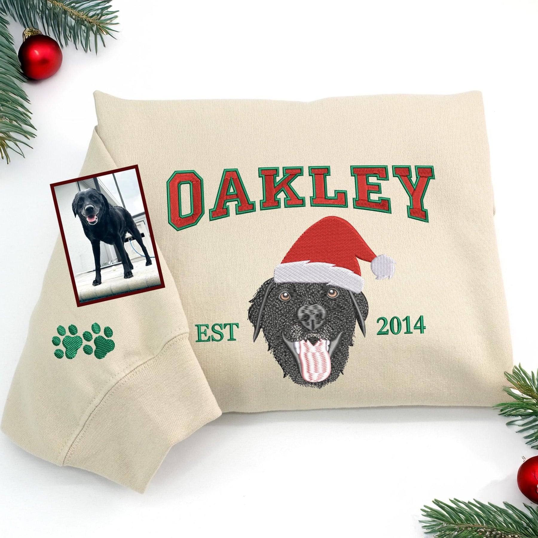 Sweat-shirt brodé personnalisé avec portrait d'animal de compagnie en couleur, année estimée et chapeau de Noël