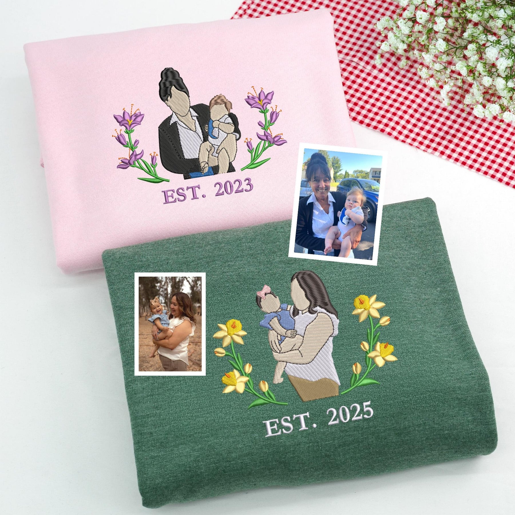 Offrez à maman un sweat-shirt vraiment unique, brodé à partir de votre photo et orné des fleurs de naissance de ses enfants.