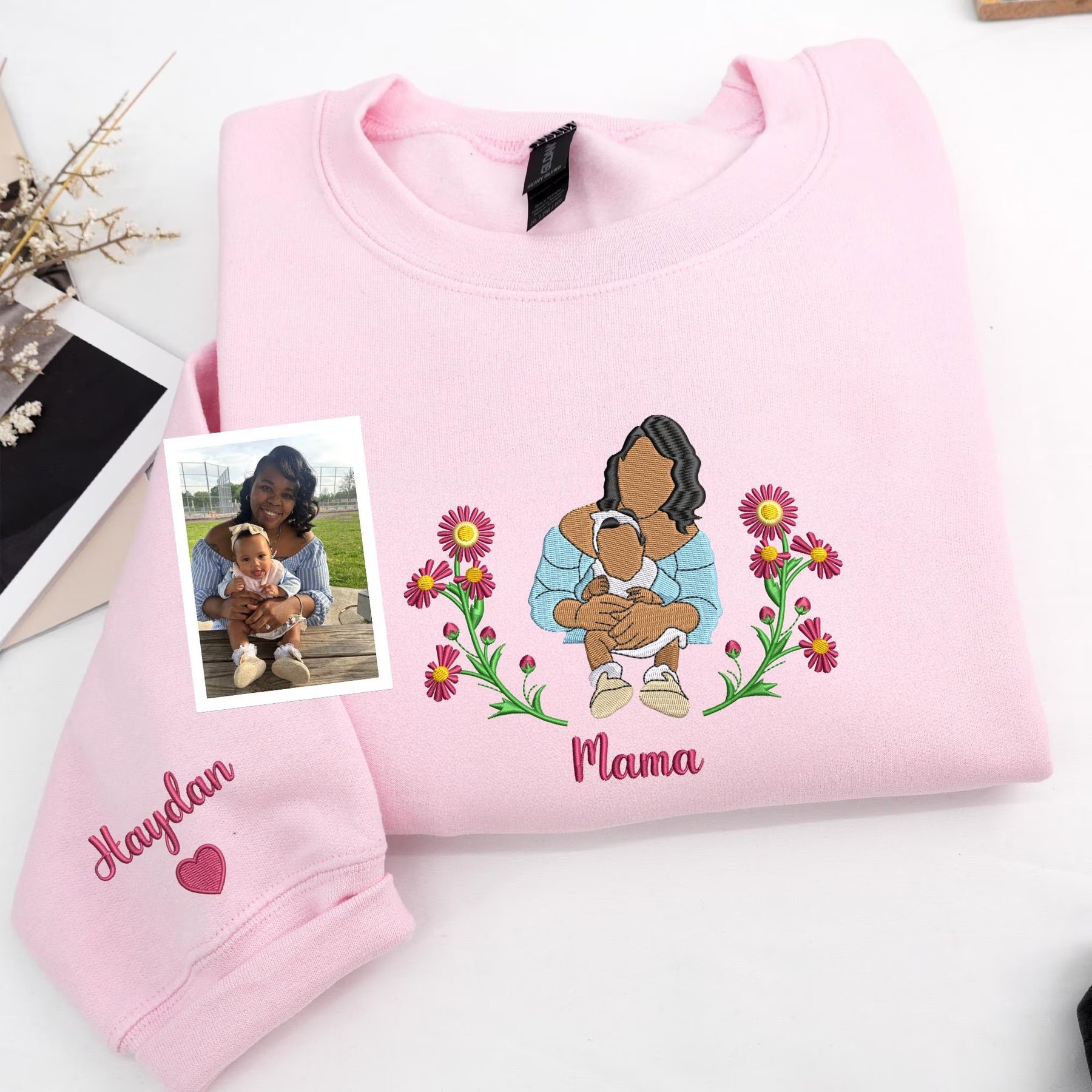 Sweat-shirt maman brodé personnalisé avec portrait photo et fleurs de naissance