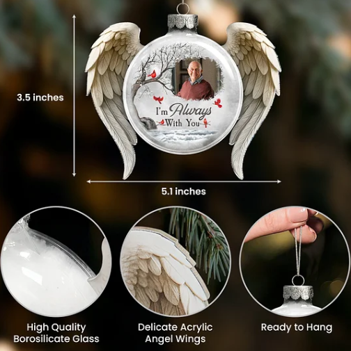 Matériaux : Fabriqué en verre transparent et rempli de fibres blanches douces, cet ornement évoque avec douceur le réconfort et la présence éternelle des êtres chers. Les ailes d'ange sont confectionnées en acrylique de haute qualité, avec des détails de plumes délicats qui ajoutent à la fois élégance et durabilité à cet ornement commémoratif significatif.