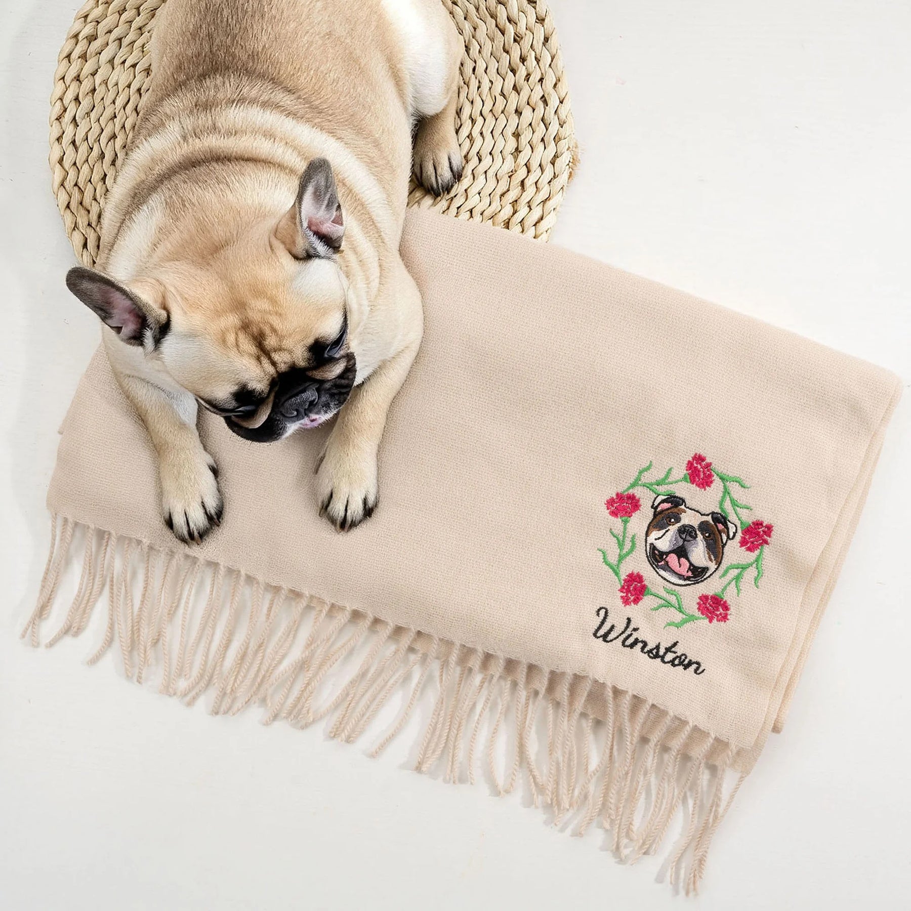 Écharpe à pompon brodée personnalisée avec photo d'avatar d'animal de compagnie, avec fleur de naissance et nom